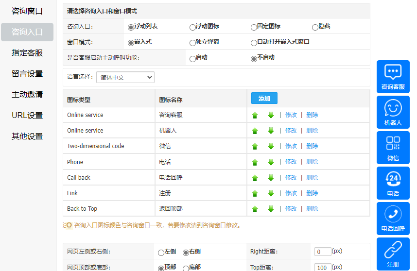 訪客可在客服休息時(shí)間或忙碌未及時(shí)回復(fù)時(shí)將自己的聯(lián)系方式留下,等待客服回呼解決問題,可在“系統(tǒng)設(shè)置-媒體對接-網(wǎng)頁(網(wǎng)站)-設(shè)置-咨詢?nèi)肟凇?/span>